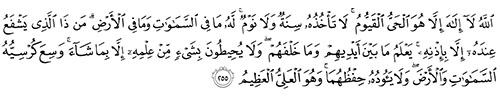 “Allah , tidak ada Tuhan melainkan Dia yang hidup kekal lagi terus-menerus mengurus (makhlukNya), tidak mengantuk dan tidak tidur. KepunyaanNya apa yang ada di langit dan di bumi. Tiada yang dapat memberi syafaat di sisi Allah tanpa izinNya. Allah mengetahui apa yang di hadapan mereka dan di belakang mereka dan mereka tidak mengetahui apa-apa dari ilmu Allah melainkan apa yang dikehendakiNya. Kursi Allah meliputi langit dan bumi. Dan Allah tidakmerasa berat memelihara keduanya dan Allah Maha Tinggi, lagi Maha Besar.” (Surah al-Baqarah: 255)